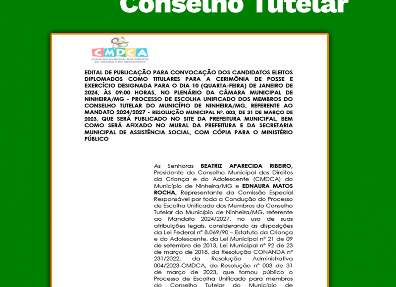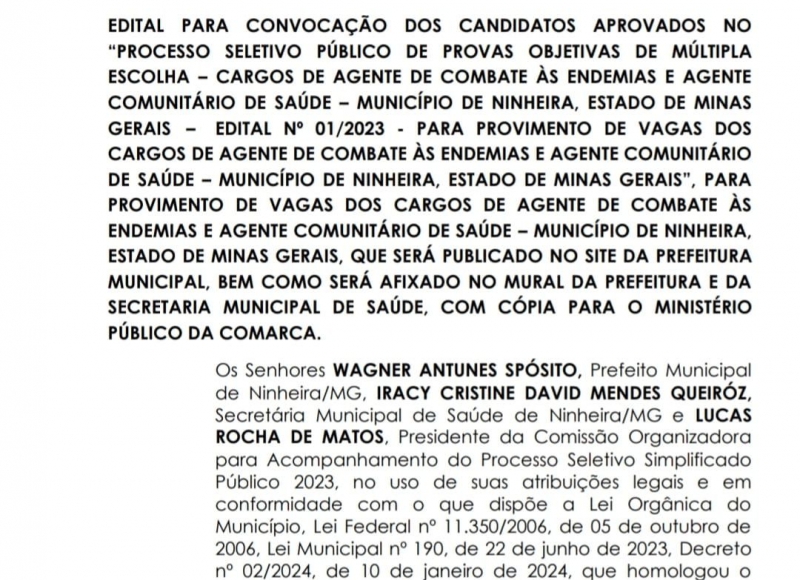 A PREFEITURA MUNICIPAL DE NINHEIRA, torna público Dispensa de forma Presencial 02/2025, Processo 03/2025 para CONTRAÇÃO DE SERVIÇOS DE ASSESSORIA JURIDICA PARA AUXILIAR E ASSESSORAR A PROCURADORIA MUNICIPAL. A se realizar no dia 24/01/2025 as 10:00 horas, na sede sala de Licitações, no Prédio da Prefeitura Municipal de Ninheira. O Edital está disponível na sala de licitações, no endereço Av. Domingos Jose de Matos, 64, Centro – Ninheira/MG ...